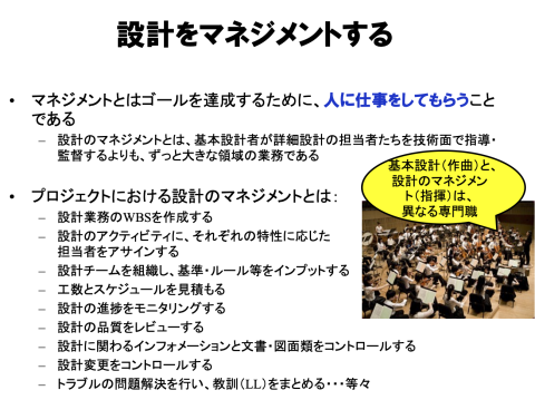 講演では大規模プロジェクトのプロマネを、オーケストラの指揮者にたとえましたが、作曲家(=設計者)と指揮者は別の職能です。作曲者がタクトを振るのがいつでも最善、とは限りません。設計の能力と、設計マネジメントの能力はまったく別物だからです。