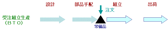 受注組立生産を英語では普通、Assemble to Order=ATOと呼ぶ。受注組立生産は、在庫リスクをある程度抑えながら、短い納入リードタイムを実現できる。Dell Computer社は、このやり方を同社のネット直販方式と組合せ、受注当日出荷・翌日配送(地域によるが)を売り物にして大いに市場シェアを取った。Dell社がこのやり方を、あえてBuild to Order=BTOと呼んで違いを強調したこともあって、今日ではBTOという用語の方が広く普及しているようだ。