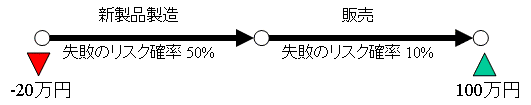 このままでは難しいと感じるなら、ためしに、この問題をもっと単純化してみよう。アクティビティを「製造販売」たった一つにまとめてしまおう。かかる費用は20万円。失敗するリスク確率は、100%-50%×90% =100%-45% =55%となる。もし、このプロジェクトがうまくいけば、収益は100万-20万=80万円の価値を生み出す。
