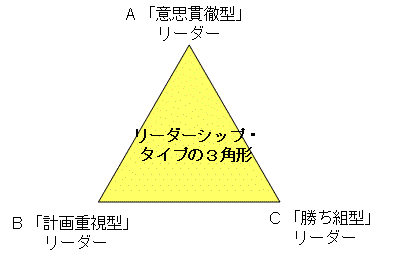 それは、この3種類のリーダーシップ・タイプを頂点とした、理想論の三角形を描いてみるとわかる。上から時計回りで、A「意志貫徹型」・B「計画重視型」・C「勝ち組型」を頂点に置いてみよう。あらゆるリーダーは、三要素の強さに従って、この三角座標の中に位置できるはずである。意志力が大事だが計画も一応必要、と思うものはやや左上に位置し、運の強さが大事だが知性も必要、と思う人はやや右下側にいるはずだ。