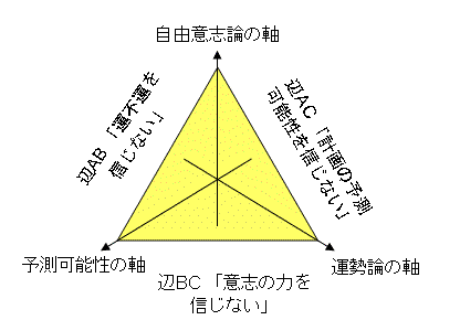 では、底辺BC上に位置する共通項は? それは、「意志の力を信じない」だ。だって、B(予測通り物事は起こるはず)、C(運が全てを決めている)なのだから。底辺とAを隔てるのは、「自由意志論の軸」なのである。