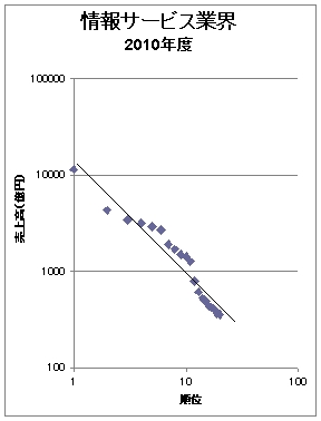 ここで、IT業界の企業ランキングを調べてみる。2009年度の情報サービス業のランキングで上位20傑を選び出して、横軸に順位を、縦軸に売上高をプロットしてみたんだ。ちょっとそこの書類鞄あけてみてくれる? うん、その一番上にあるやつ・・つまり、こういうものだ。