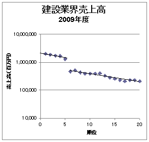 --日本では、何故かそういう仕組みらしい。おまけに、このグラフの面白いところは、上位5社とそれ以下の15社では別の直線に乗っていることだ。つまり上位ゼネコン5社が圧倒的に強くて、それ以下は『中堅ゼネコン』になってしまうらしんだね。不思議な階級社会といえるだろう。