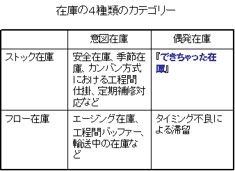 ちなみに、前回「その在庫はストックですか、フローですか?」で述べたように、在庫は下流側消費予定の有無によって「ストック在庫」と「フロー在庫」に分類できる。したがって、在庫は全体として4種に分類できることがわかる。