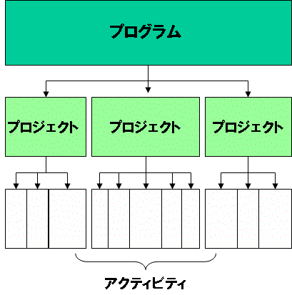 プログラムとかプロジェクトといった用語・概念は、’60年代米国のアポロ計画のあたりから使われるようになった。アポロ計画自体は、プログラムである(=The Apollo Program)。プログラムの下に、アポロ1号、アポロ2号、などロケット打ち上げに関する個別ミッションがある。これが「プロジェクトProject」と呼ばれた。プロジェクトはさらに、設計・製作・飛行などの「フェーズPhase」(あるいはActivity)に分解される。このように、巨大な事業全体を、構造的に分解して、管理していくのは、米国的思考法の得意とするところだ。