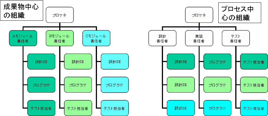 しかし、たいていの会社では、すでに組織の器が決まっている。そして、その形に合わせてWBSを(なかば無意識に)決めることになる。会社がゼネコンやSIerなら、タスクフォース型組織になる(つまり成果物中心型)だろうし、製造業なら、まず間違いなく機能型組織だからプロセス中心型WBSになる。プロジェクトのWBSは、こういうパターンにするのが「当然だ」と思いながら。