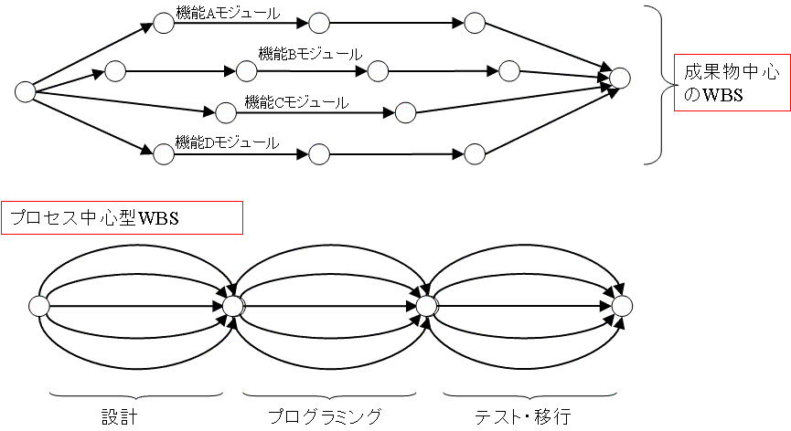 そして、このような組織の違いは、何を生みだすだろうか。このプロジェクトのロジック・ネットワーク(アロー・ダイアグラム)を描いてみれば、一目瞭然だ。成果物中心型なら、スケジュール的にも各モジュールはばらばらに進行していきがちである。他方、プロセス中心型WBSならば、設計全体に対する責任者がいるわけだから、彼または彼女は、設計が一応まとまって全体の整合性をとってから、先に進もうとするだろう。つまり、プロジェクトはフェーズ単位に進行していくことになるはずだ。
