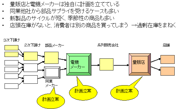 しかも電機業界は面白くて、部品を同業他社から仕入れたりすることがあります。日立の製品をあけると、中に東芝のチップが入っていたりします。そうなると、一つのサプライチェーンで、需給計画を立てている会社が二つも三つも存在することになる。それぞれ別の見込で動きます。おまけに、新製品のサイクルが短く、季節性の商品も多い特性があります。さらに消費者は、店頭に在庫がないと別の商品を買ってしまいます。このため、過剰在庫をまねく傾向が強いのです。