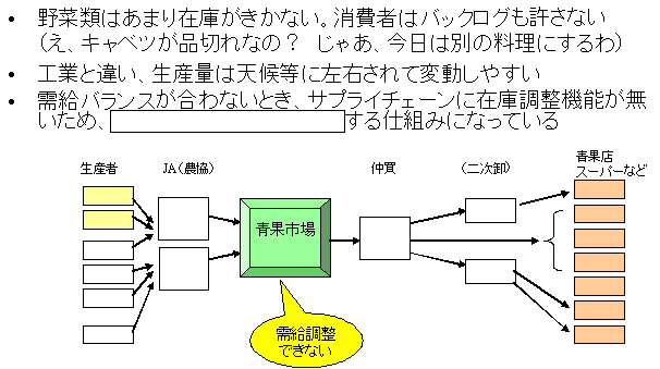はい。結構です。農業って、大変ですよね。なぜ、大変なんでしょうか? 力仕事だから? いえ、近頃は結構、機械も進歩してきました。問題は、やはり需要と供給にあるのです。野菜類はあまり在庫がきかない特徴があります。自動車や家電製品との大きな違いですね。おまけに、消費者はバックログ(受注してから仕入れる事)も許しません。え、キャベツが品切れなの? じゃあ、今日は別の料理にするわ、という訳です。