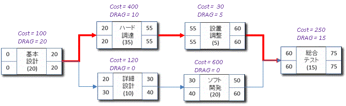 ところで、このDRAGの数値に、上で説明した納期遅延のコストをかけたものを、DRAG Costと呼ぶ。たとえば、遅延コストは1日あたり20万円だったとすると、DRAG=8日の作業項目のDRAG Costは160万円、という計算になる。これは、各作業項目が納期に与える影響をコストに換算したものだと思えばよい。