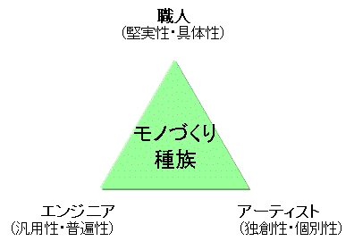 職人は今や絶滅危惧種だが、職人に類似した生きものに、「エンジニア」と「アーティスト」がいる。これらはみな、『モノづくり』種族に属する。ただし、エンジニアは背景に西洋近代科学があるため、普遍性・汎用性を指向する。ここが大量生産時代にマッチしていたため、職人と入れ替わるように一時かなり繁殖した。一方アーティストはつねに少数だが、独創性・個別性の世界に生きている。