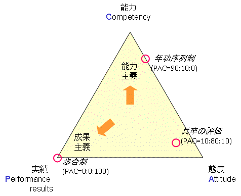人事評価のあり方は、この3つのモノサシにかける比重の違いであらわせると、考えられる。たとえば、能力(C)が40%、態度(A)と業績(P)が30%ずつのウェイトならば、C:A:P=40:30:30ということになる。もっと能力点の比重が高いところは、C:A:P=60:20:20になるだろう。かりにC, A, Pそれぞれを頂点にとって三角形を描けば、各評価制度はその内部の一点として表せる。そこで、これを人事評価のC:A:Pモデル、と呼ぶことにする。