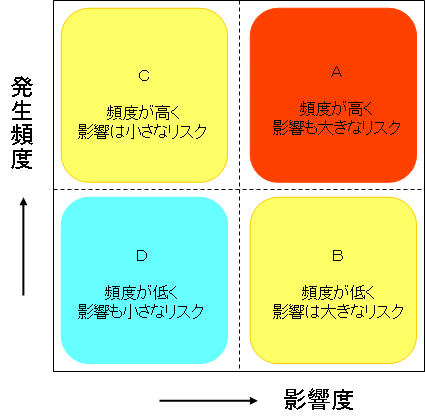 当たり前だが、右上の象限(A)にあたる部分は、「インパクトが大きく・かつ・頻度も高い」リスクのカテゴリーを表す。だから、リスク対策ではここが最優先になる。