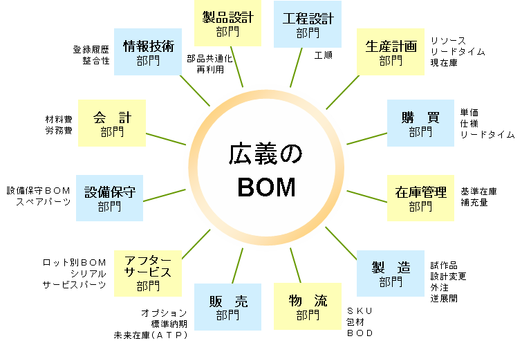 なぜBOMが分裂するのか。皮肉なことだが、BOM情報を必要とする部門がきわめて多いからだ。BOMとマテリアル・マスタには、部品構成以外に工程や原価やリードタイムや購入先やオプションや保守履歴など、多種多様な情報が関係している。いわばBOMは企業内の情報のハブなのである(下図)。にもかかわらず、縦割り組織や分業病の影響で、社内にBOMを統一的に保守する責任部署が存在しないケースが多いのだ。
