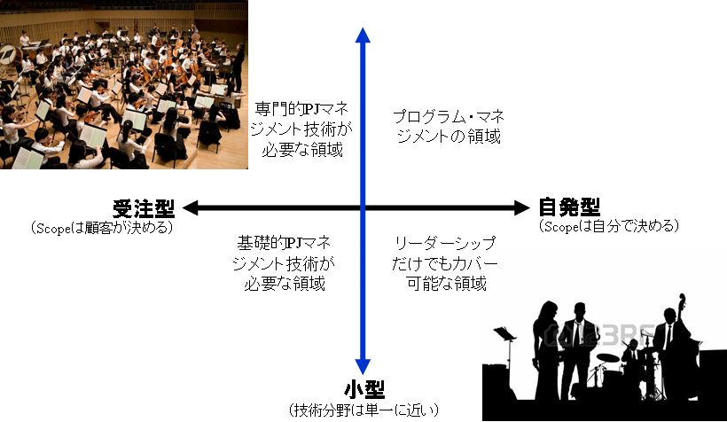 両者をたとえていうならば、左上の大規模受注型プロジェクトはオーケストラのようなものだ。他種類の楽器からなる専門職集団を、一人の指揮者が引っ張っていく。指揮者は自分では演奏したりしない。演ずるべき曲(スコープ)は、作曲家から与えられる。これに対して、右下の小規模自発型プロジェクトはジャズ・バンドのようなものだ。指揮者はいない。バンドリーダーはいるが、ソロのときには各人がリードする。曲は、そのときの状況に合わせて自由に即興で演じていく。両者で、演奏をまとめるスタイルがまったく異なるのは分かるだろう。