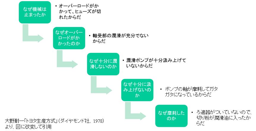 図は、トヨタ生産方式の生みの親である大野耐一氏の著書から一例をとって、図示したものだ。工場内のある生産機械が故障してとまったとき、「なぜ機械は止まったか?」の問いに、「オーバーロードがかかって、ヒューズが切れたからだ」と答えただけでは、じゃあヒューズを交換して再起動すればいい、という答えしか出てこない。