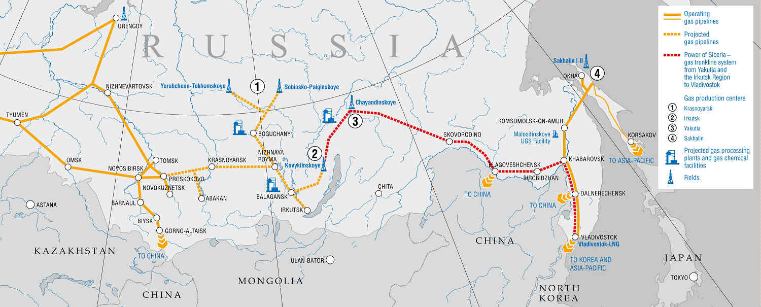 さて、この天然ガスは、シベリアのChayandinskoyeおよびKovyktinskoyeガス田から供給することになっている。だが、どちらのガス田も、まだ生産設備は十分開発されていない。さらに、このガスは通称「シベリアのパワー」と呼ばれる長大なパイプラインで中国に運ばれる。総延長距離は約4,000km。米国の西海岸と東海岸くらいの距離である。そしてこのパイプラインも、これから建設するのだ。したがって、中国にガスが供給されるのは、最低でも4~6年後だと想定される(だから冒頭の例では10分の1で「半年後」に供給予定と書いた)。とにかく、気の遠くなるほど遼遠な、大陸的商談なのだ。