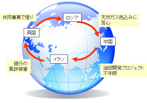 かくして、話は、中国→イラン、イラン→英国、英国→ロシア、ロシア→中国、と一巡する。この順に、それぞれ悩まされる種を抱えており、こっそりギブ&テイクの関係をとりむすぼうとしている訳である。こんな風に、素人が片手間にちょっと見ただけでも、石油・ガス業界の目立たぬニュースをつないでいくと、目に見えにくい蜘蛛の糸のような形で、世界のあちこちがループのごとく結びつきあっていることがわかるのだ。