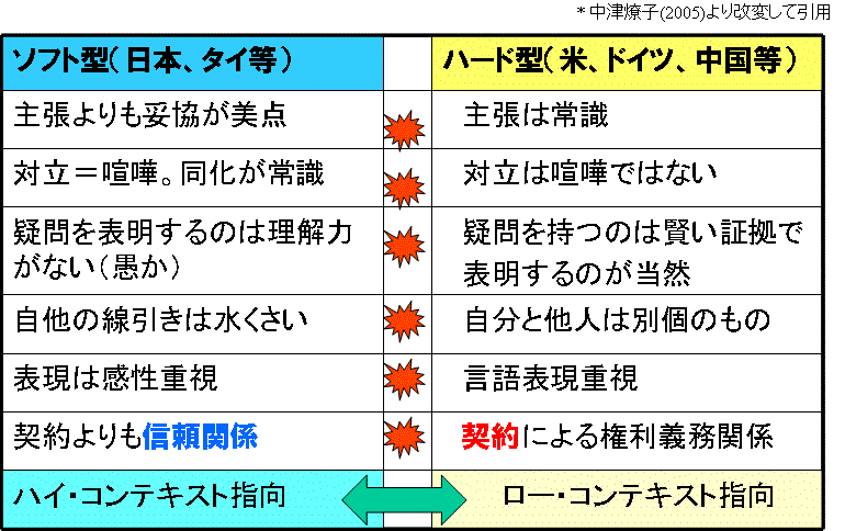 〔ソフト型文化)「対立は喧嘩と考える」 ←→ (ハード型文化)「対立は喧嘩ではない」