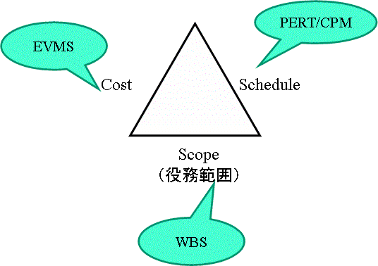 ところで、上記の三つのマネジメント技法は、それぞれがちょうど『鉄の三角形』の三辺に対応している。スコープをマネージしたければWBSを、コストをマネージするにはEVMSを、そしてスケジュールにはPERT/CPMという具合だ(図参照)。この対応関係は、偶然の産物ではあるまい。プロジェクトを運営して行くにあたって、最大の制約条件を何とかコントロール下におさえるべく、上記三つの技法がそれぞれ発達してきた、という事情なのである。