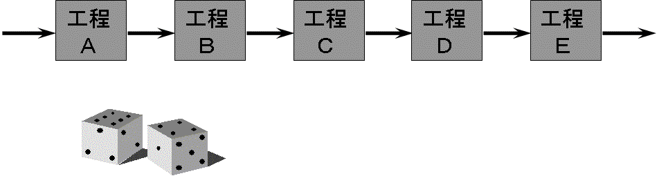 仮にいま、5工程からなる生産ラインを考えましょう。「工程」は必ずしも製造工程と限りません。包装・検査・搬送かもしれないと考えてください。そして各工程の一日あたりの処理速度と原材料の投入量を、均しくサイコロの目の数(1~6の乱数=平均値3.5)で与えることにします。各工程とも手持ちの仕掛在庫量はゼロからスタートします。