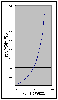 で与えられる(これは工場では、工程の前に積まれている仕掛在庫量に相当する)。グラフにすると、こうなる。ρが1に近づくほど、待ち時間は急激に増大することに注意してほしい(厳密にはポアソン到着とか指数分布などの仮定があるのだが、詳細は省く)。