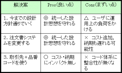 --つまり、このまま進めば、ユーザに運用を変えてもらって、少しだけ手間が増えるのを我慢してもらうか、さもなければシステムの設計変更をするか、二つに一つです、という訳かな。大勢のユーザに文句を言われるか、開発会社から追加費用を請求されるか、どっちかしかありません、と。