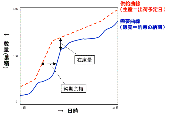 これでお分かりだろう。在庫圧縮とリードタイム削減は、まったく同じ問題の両面なのである。何の問題かって? それは、「需要曲線と供給曲線の不一致」という問題だ。言いかえると、生産管理の第一の課題とは、需要曲線と供給曲線をうまく一致させることにある。「生産管理の目的は、最小の在庫で最短のリードタイムを実現すること」と言う人も、ときどきみかける。それも、同じ事を言っている。つまり需要曲線と供給曲線が、どちらが上でもなく下でもなく、つまり一致させるべきだという意味だ。