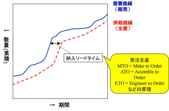 たしかに、その通りだ。受注生産形態では、受注量で累積需要曲線を引くと、累積供給曲線よりも上側(左側)に来る。そして、受注の時点から納入の時点までの差(横の幅)は、すなわち納入リードタイムを指している。では、縦の差は? それは、ある時点での受注残高(注残)を示しているのだ。
