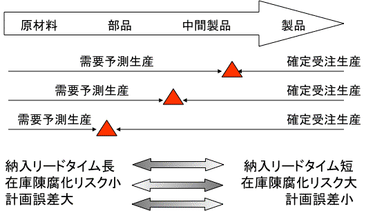 そして、どの生産形態であれ、主要なストック・ポイントまでの上流側は、需要見込み(需要予測)で製造し、下流側は確定受注にひもづいた製造になる。もし、主要なストック・ポイントを上流側にもっていけば、受注から納入までのリードタイムは長くなるだろう。リードタイムが長いと言うことは、生産計画(需要見込み)の誤差も大きくなる。ただし、汎用的な原材料のストックだから、在庫の不動化・陳腐化リスクは小さくなる。逆に、ストック・ポイントを下流側に移すほど、納入リードタイムは短縮され、計画誤差も小さくなるが、在庫品の汎用性は失われ、陳腐化リスクは大きくなる。