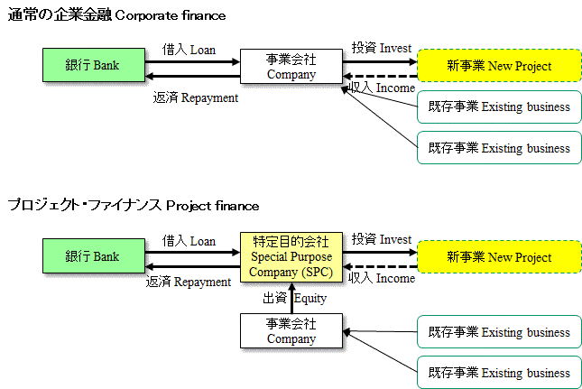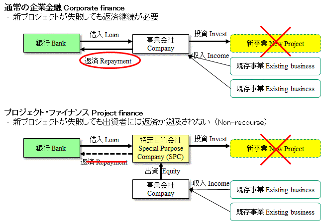 図を見て欲しい。通常のコーポレート・ファイナンスでは、事業会社は複数の事業を営んでおり、基本的にはその信用力をベースに融資する。新興国に現地法人を設立して取り組んだ発電プロジェクトが途中で失敗した場合でも、返済請求は出資者である事業会社に遡及されてくる。通常は、そのために「親会社保証状」を要求される(つまり連帯保証である)。あるいは逆に、その新興国の政府自体に、保証人になることを要求するケースもある。これをソヴリン・ファイナンスとよぶ。ソヴリンSoverignとは国王とか主権者のことだ。