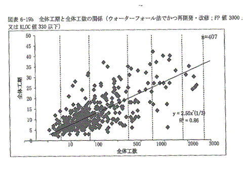 JUASの2014年度調査は、会員企業からのアンケート調査で集められた累計1,076件のプロジェクト実績データを分析している。ちなみにこのグラフにプロットされたデータ数は407点。条件は、ウォーターフォール法で進められた再開発・改修プロジェクトで、FP(ファンクション・ポイント)値が3000以下またはソースコード量が330,000行以下のものだけを抽出したグラフである。なお図中に R2=0.86 と書かれているが、このR2は統計学で「決定係数」と呼ばれ、回帰式で説明できる分散(バラツキ)の割合を示す。プロジェクト全体期間の長さは、バラバラであるが、その86%が「全体工数の1/3乗」との関係で決まる、ということをおよそ意味している。