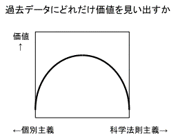 いずれの立場も、主義主張であるから、それ自体が正しいとか正しくないとかは簡単に議論しがたい。しかし、この両者は両極端であるにもかかわらず、不思議な共通点がある。それは、JUASが苦心惨憺して集めた過去のデータは価値がない、と見る点だ。JUASのこの報告書の著者は、科学法則主義でも個別主義でもなく、その中間の立場にいる。そして、過去のデータはそれなりに参考になるし、価値があると考える。過去のデータの価値をどれだけ認めるかを模式的なグラフにしてみると、両端がゼロ(無価値)で、真ん中が盛り上がる形になっているにちがいない。
