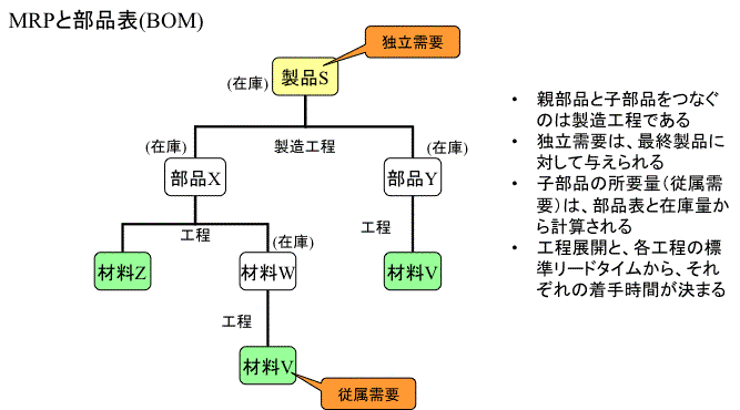 (4)このようにして求められた生産工場における従属需要(所要量)が、その工場の基準生産計画(MPS=Master Production Schedule)に相当する。あとはMRPの手順に従って生産計画・購買計画を立案する。