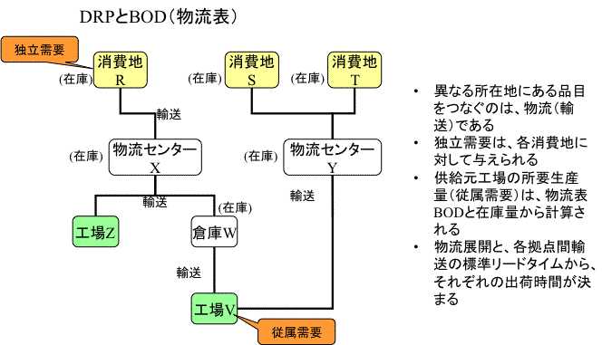 DRPでは、BODというデータを中心的に用いる。BODはBill of Distributionの略で、マテリアルに所在情報を付加したリストである。日本語には対応する適当な言葉がないので、ここでは「物流表」と仮に呼ぶことにしておくが、MRPでいうBOM(部品表)に相当する。製造の世界では、同じマテリアルはどこにあっても同じマテリアルだが、広域物流と輸送機能を考えた場合は、たとえ同じマテリアルであっても、テキサスにある物とニューヨークにある物を同一視できない。テキサスの工場で製造したマテリアルをNYのデポにもってくるには、輸送という作業が必要になるからだ。