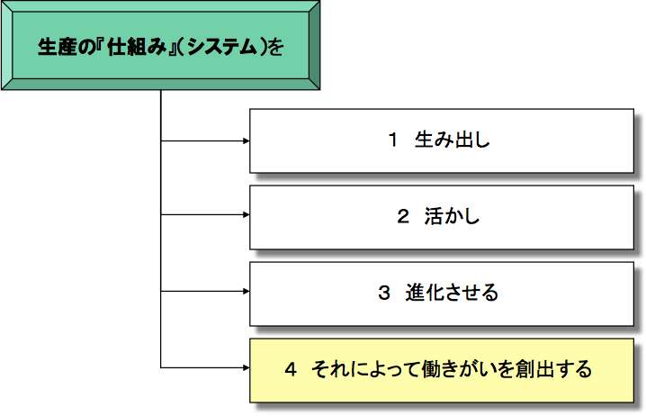 使命の中に「進化させる」ことが含まれているから、この使命は永続的で終わりがないことを示している。生産の仕組み(システム)とは、生産のための機械設備や、働く人々や、そのための空間(建屋)や、情報・データをやりとりする手順全てを含んでいる。なお、「システム」という言葉を使ったが、これはコンピュータとは直接関係がない。すべて紙と帳票で動かしていたって、それが『仕組み』である以上はシステムと呼べる。