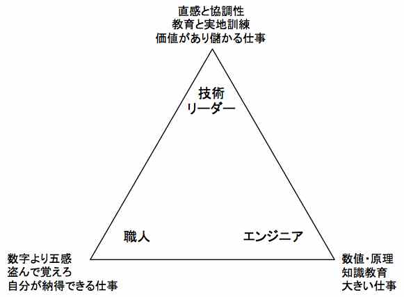 こう考えると、ものづくりに携わる人たちには、三つの類型があるように思える。職人と、エンジニアと、技術リーダーだ。三つの頂点が作る三角形の中に、自分を付置してみるのも面白い。そして自分の目指す方向も描いてみる。たいていの理系大卒の人間は、右下隅のエンジニアの卵としてキャリアをはじめる(わたしもそうだった)。その後、エンジニアであり続ける人もいるが、科学原理は脇に置いて、リーダーとして人を動かし、世に認められる(商業的にも)仕事を目指していく者もいる。また科学原理を離れ、職人的になって自分の感覚を頼りに、守備範囲を孤独に掘り下げていく人もいる。どれを選ぶかは上等下等というより、価値観の問題だ。