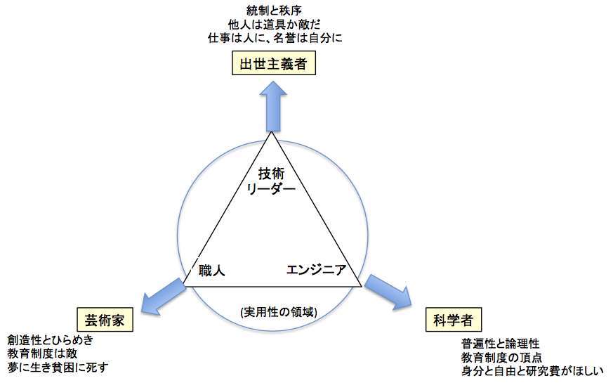 日本には大勢の技術者がいる。わたしもまあ、そのはしくれだ。では、技術者が目指すべきキャリアパス上の目標は、どのような姿であるべきか。その問題についてわたしはこのところ、ずっと考えている。「職人的であること、エンジニアであること」https://mgt-technology.info/24607574/ の中で、わたしは、[エンジニア] – [職人] – [技術リーダー]の三角形の領域を考えた。エンジニアのキャリアパスは、ある意味、この領域上にある。