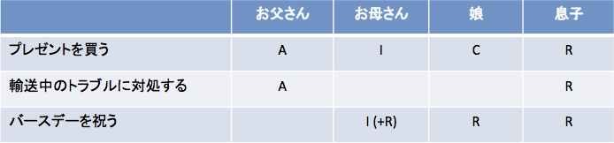 「プレゼントを買う」アクティビティについては、知恵を出した(C)のが姉、承認してお金を出した(A)のが父、店に買いに行く作業をした(R)のが弟、そして(時間差はあるが)結果を知らされる(I)当事者が母だ。
