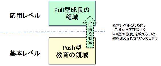 これに対し、応用的な知識やスキル(主にソフト・スキル)は、受け手が自分から学びに行く(Pull型)べきものである。そうでなければ、能力として本当には身につくまい。そのためには、Pullの知識獲得のための態度・思考習慣(OS)を持つことが必要だ。また、応用レベルは一般にマニュアル化に向かない。範囲が広く例外事象が多いため、教科書・マニュアルでカバーするには効率がわるすぎるからだ。