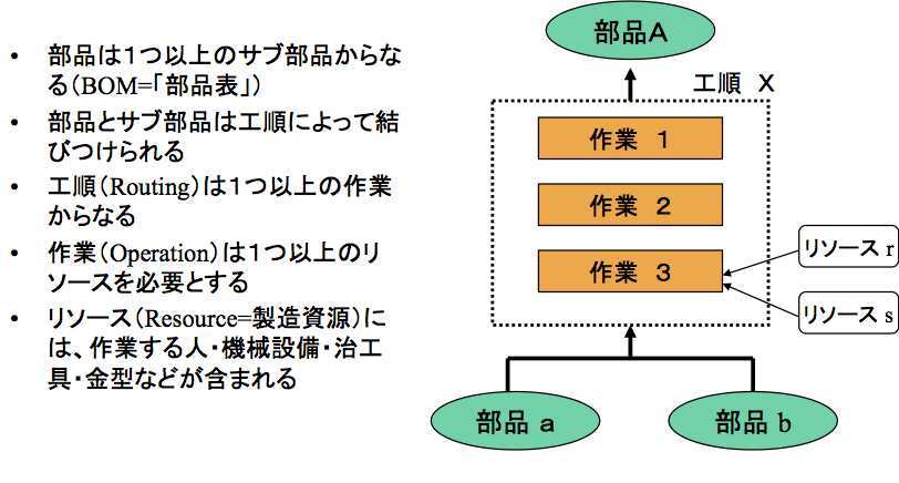 なお、図の中には「リソース」(Resource=製造資源)という言葉が出てくる。これは、作業の間は占有するが、作業した後でも別の作業に再利用できるようなものを指す用語だ。具体的には、作業する人・機械設備・治工具・金型などが含まれる。つまり、機械とか作業者とかよりも、1レベル抽象度を上げた用語である。このリソースのリストのことを、「資源表」(BOR = Bill of Resource)と呼ぶこともある。