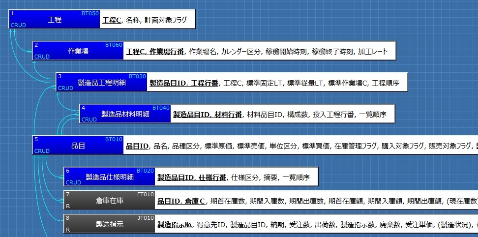 この図を見ると、(5)「品目」レコードに対して、複数の(4)「製造品材料明細」レコードがぶら下がっている(渡辺氏の図法では、「∈」は1:Nの関係を示す)。これは、一つの親部品が、複数の子部品から組立・加工されて作られる「親子関係」を示している。そして、(5)「品目」レコードに対し、(3)製造工程明細が、やはり複数ぶらさがっている。つまりここでは、品目が主であり、工順・作業が従であることが表されているのだ。(細部に興味がある方はダウンロードして、全体をご覧になることをおすすめする。非常に勉強になると思う)