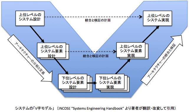 これに似た図は、ITエンジニアの人たちなら、見たことが多いのではないだろうか。日本でも、大手ITメーカーの社内標準や開発プロセス定義に取り入れられている。INCOSEのハンドブックの説明によると、このV字モデルの概念は1990年頃に萌芽が生まれたが、このような形で提案されたのは、Forsberg, Mooz & Cottermanの”Visualizing Project Management”(3rd edition, John Wiley and Sons, 2005)がオリジナルであるという。