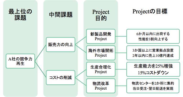 この例ではわかりやすいように、最上位の課題として、「会社の競争力再生」をおいています。そしてその次の中間課題として、「販売力の向上」と「コストの削減」をあげました。販売力の向上という課題を解決するために、2つのプロジェクトが生まれます。1つは新製品開発で、もう一つは海外市場の開拓です。さらにコストの削減という課題を解決するためには、生産合理化と物流改革という2つのプロジェクトがあげられています。スペースの関係で非常に単純な図になっていますが、構造はご理解いただけると思います。