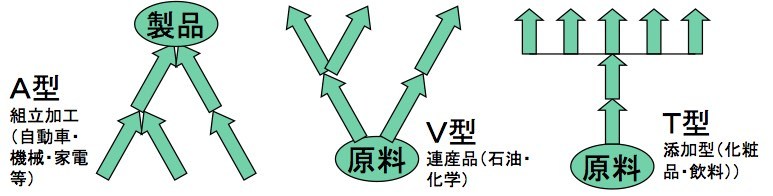 しかし、これだけでは記事としてあんまりだろうから、一例として、上記の前提条件(5)があてはまらないケースについて、少しだけヒントを書いておく。A型のBOMとは、複数の部品を組み立てて、サブアッシーをつくり、製品を作っていく、集合型の部品表のことだ。これが当てはまらない場合とは、たとえば共通の中間部品・材料から、多数のバリエーションが生じるV型、T型のBOMのケースである。