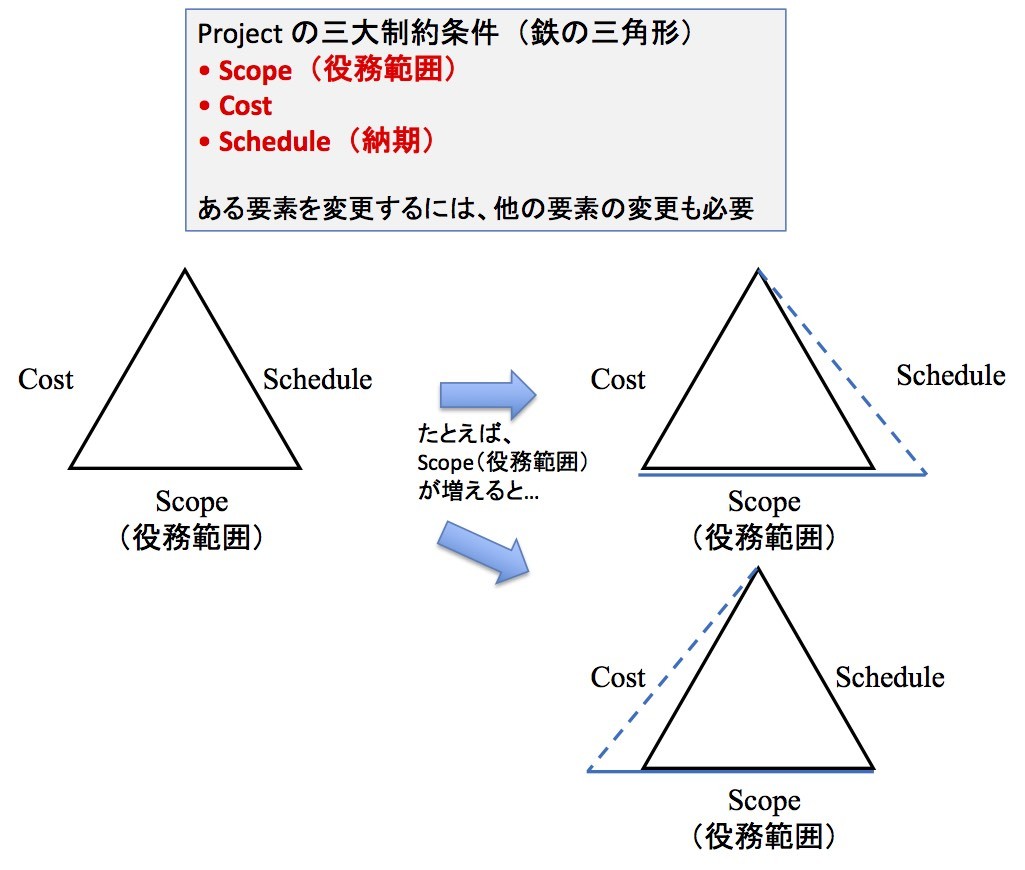 図を見てほしい。三角形の底辺であるスコープを長くすると、どちらかの斜辺を同時に長くせざるを得ない。いや、しばしばあることだが、スケジュールとコストの両方が増大したりする。