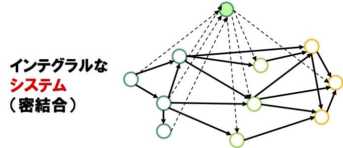 周知の通り、システムにおける要素間のインタフェースには、密結合と疎結合の2種類がある。製造現場の例で言えば、一貫生産ラインは密結合であり、工程間に在庫のスペースがあるのは、疎結合である。コンピュータなら、「ファイル渡し」は疎結合であり、APIの呼び出しなどは密結合だ。