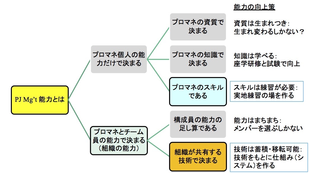 となると、プロジェクトマネジメント能力は、プロマネ個人のスキルである、ということになる。資質でもなく、知識だけでもない、と。これが三番目の考え方である。スキルとは身体化された技能で、かつ、ある程度まで属人的なものだ(「あの人のスキルはすごい」というが、「あの会社は高いスキルを持っている」とは、普通言わない)。
