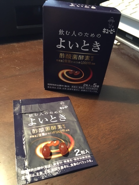 知っての通りアルコールは体内で、アセトアルデヒドを経て、酢酸に分解される。このアセトアルデヒドが曲者で、二日酔いの主原因になる。「よいとき」という製品は、このアルデヒドとアルコールを分解する作用を持っている。錠剤型のサプリになっていて、一袋2錠がワンセット、1回分である。