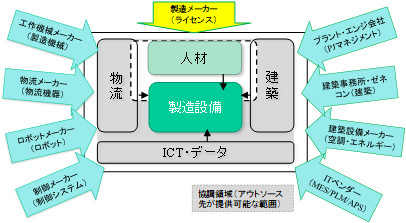 まあ、工場自前主義の脱却といっても、まだ社内にたっぷり人を抱えている超大手は別である。ここでは主に準大手・中堅企業を考えている。だが、大手でも、他社の知恵をまなぶべきときに来ていると、わたしは思う。白書にも引用されている図を見てほしい。製造業にとって、集中すべき「競争領域」は、本当に核となる自社製品の製造技術と、そのための人材育成である。それを支える周辺要素、すなわち物流・建築・ITシステムなどは、業種をまたいで共通性が高い「協調領域」であって、アウトソースする方が効率性がいい。